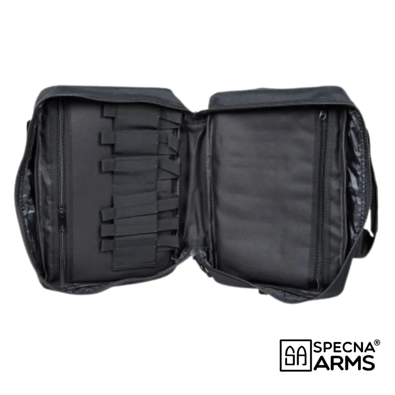 La Bolsa para Pistola Specna Arms Expert negra se divide en dos compartimentos independientes, diseñados para separar la pistola de los accesorios y facilitar el acceso rápido al equipo.