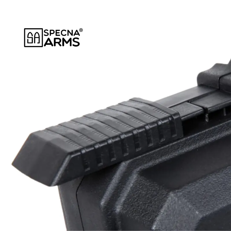 El frontal del estuche está decorado con el logotipo de Specna Arms, aportando un acabado profesional y acorde a una marca reconocida dentro del mundo del airsoft.