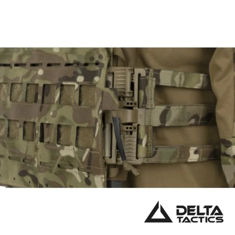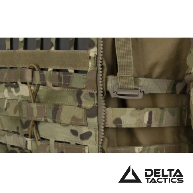 Este plate carrier airsoft permite una total integración con otros productos de Delta Tactics gracias a sus cremalleras traseras compatibles con los paneles DTX130 Cargo y DTX131 Assault. Además, incorpora clips frontales que permiten acoplar el chest rig Force MK2 y otros rigs con sistema de fijación rápido.