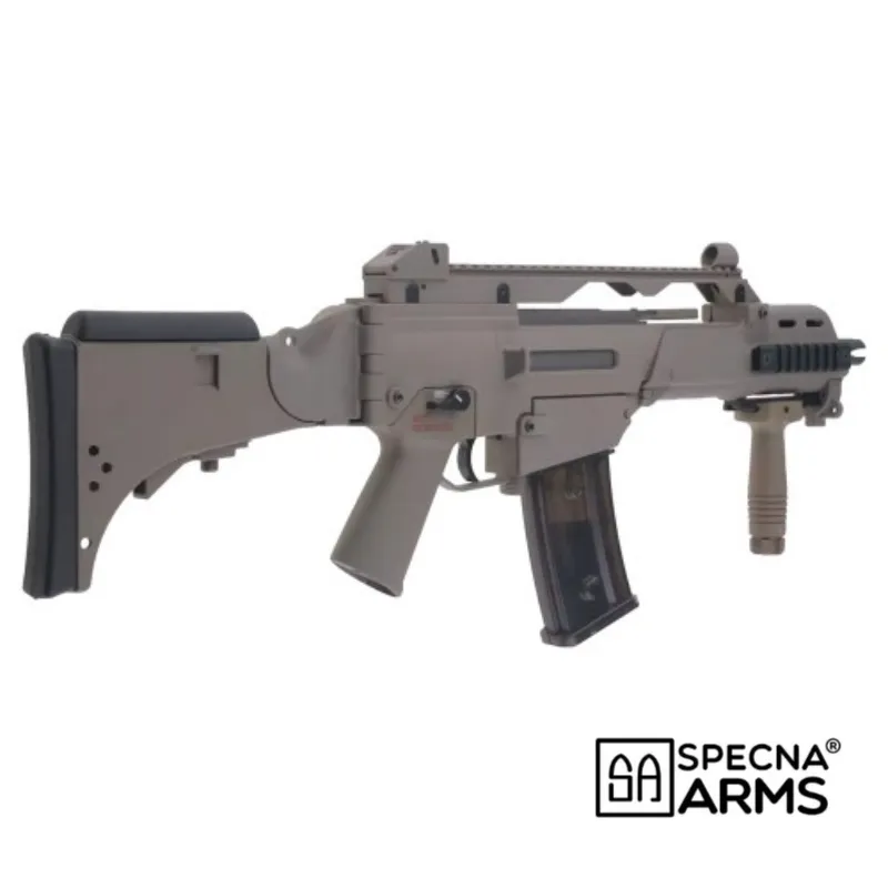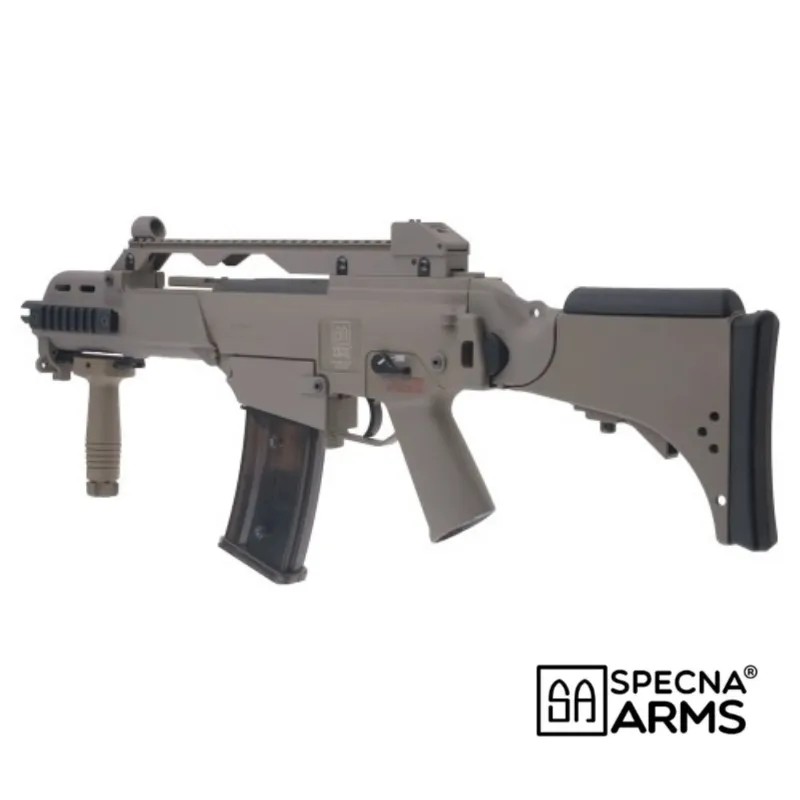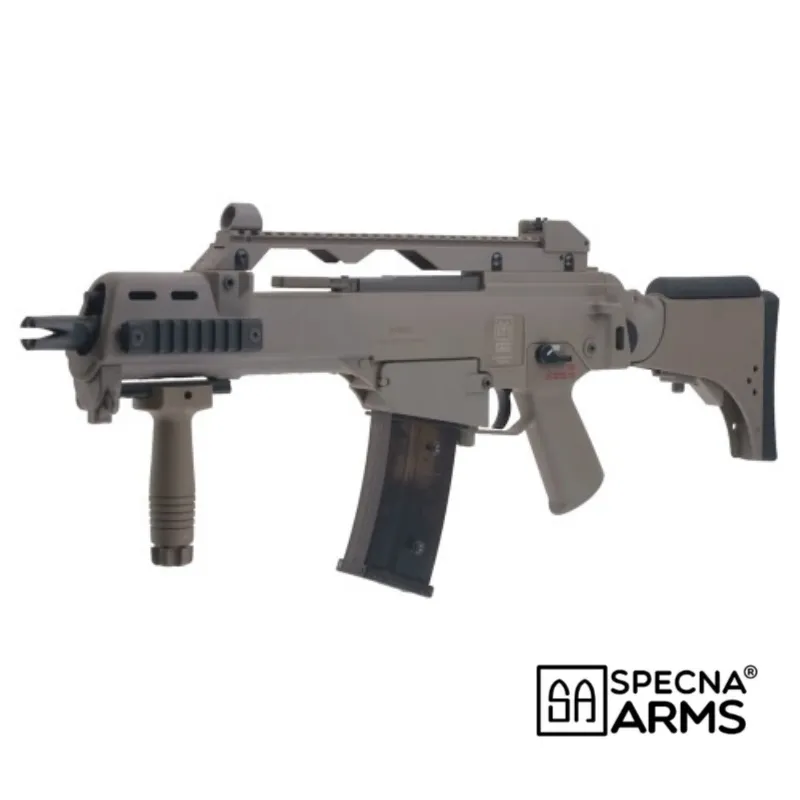 El Specna Arms SA-G12V EBB Tan es un fusil de airsoft tipo AEG diseñado para ofrecer una experiencia de juego realista, fiable y versátil. Forma parte de la reconocida serie SA-G de Specna Arms, una gama que destaca por su excelente calidad de construcción y por ofrecer réplicas robustas capaces de competir con fabricantes de alto nivel.