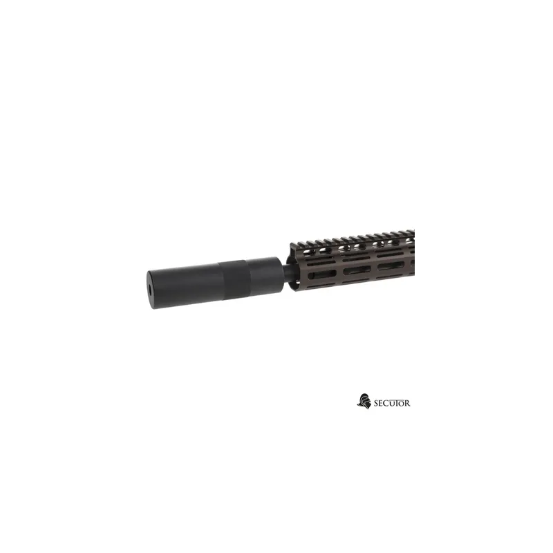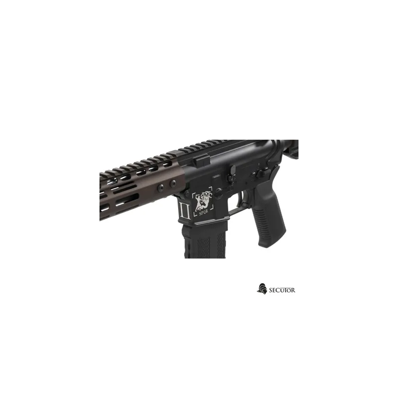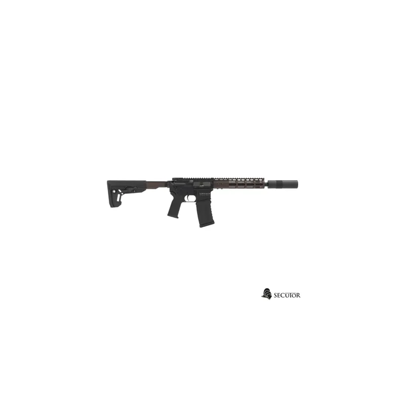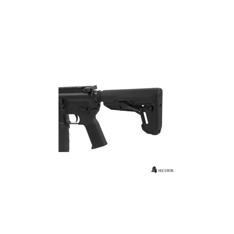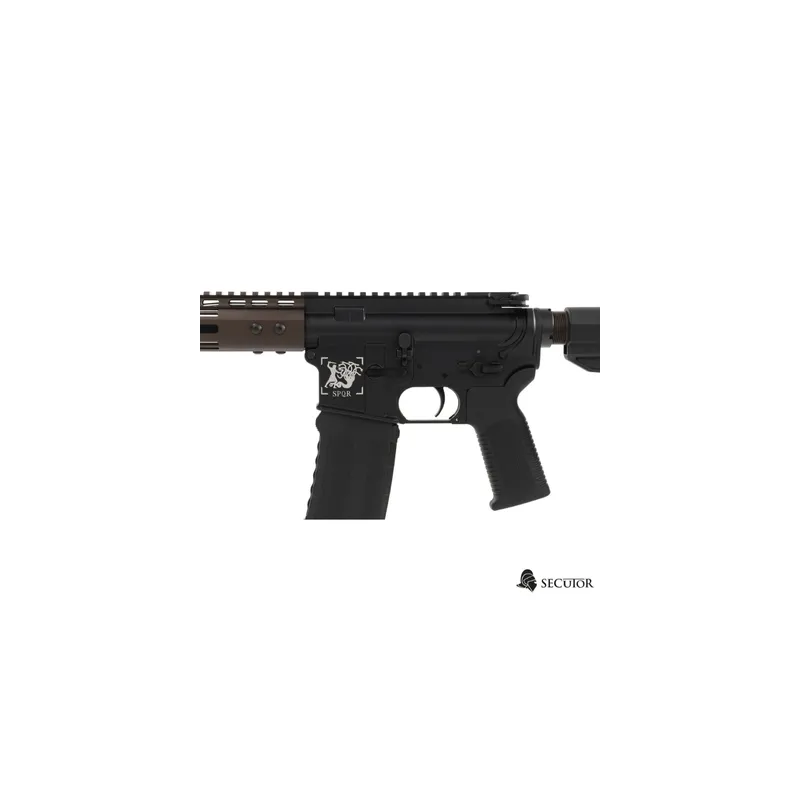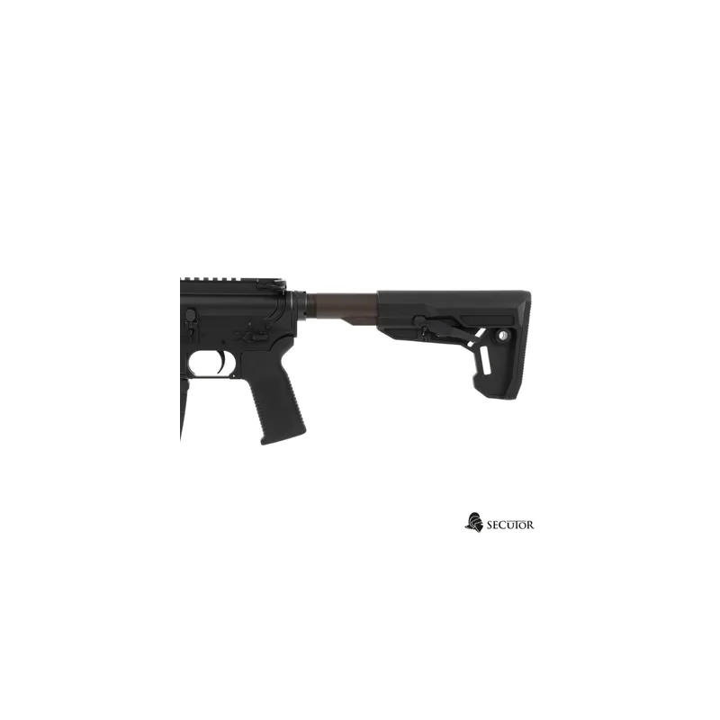 Su diseño exterior en color dual tone (negro y bronce) y el guardamanos estilo NOVESKE con sistema M-LOK le confieren una estética táctica, moderna y profesional. Además, su culata retráctil ajustable y el silenciador roscado extraíble ofrecen versatilidad para entornos CQB o de largo alcance.