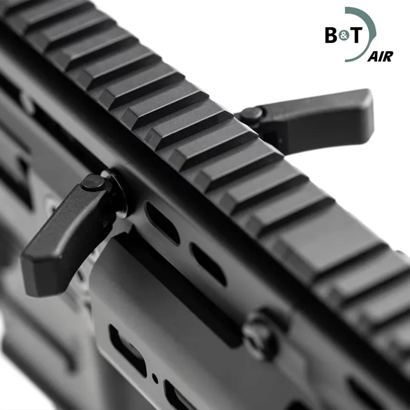 La parte superior del cuerpo (receiver, guardamanos y riel Picatinny) está fabricada en aluminio aeronáutico CNC 6061-T6 con recubrimiento anodizado resistente a arañazos y clima. El guardamanos M-LOK extendido permite acoplar visores, linternas y punteros. Todas las marcas oficiales están grabadas en el cuerpo y cargador, aportando un acabado profesional y realista.