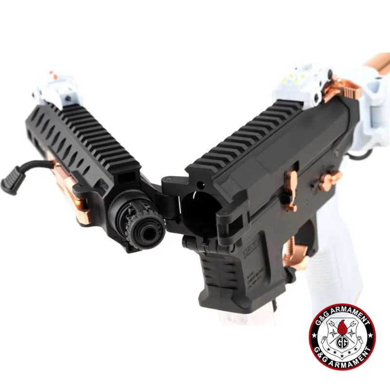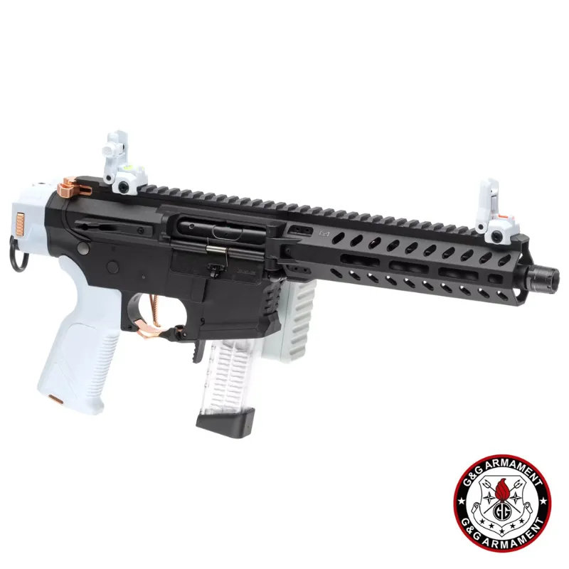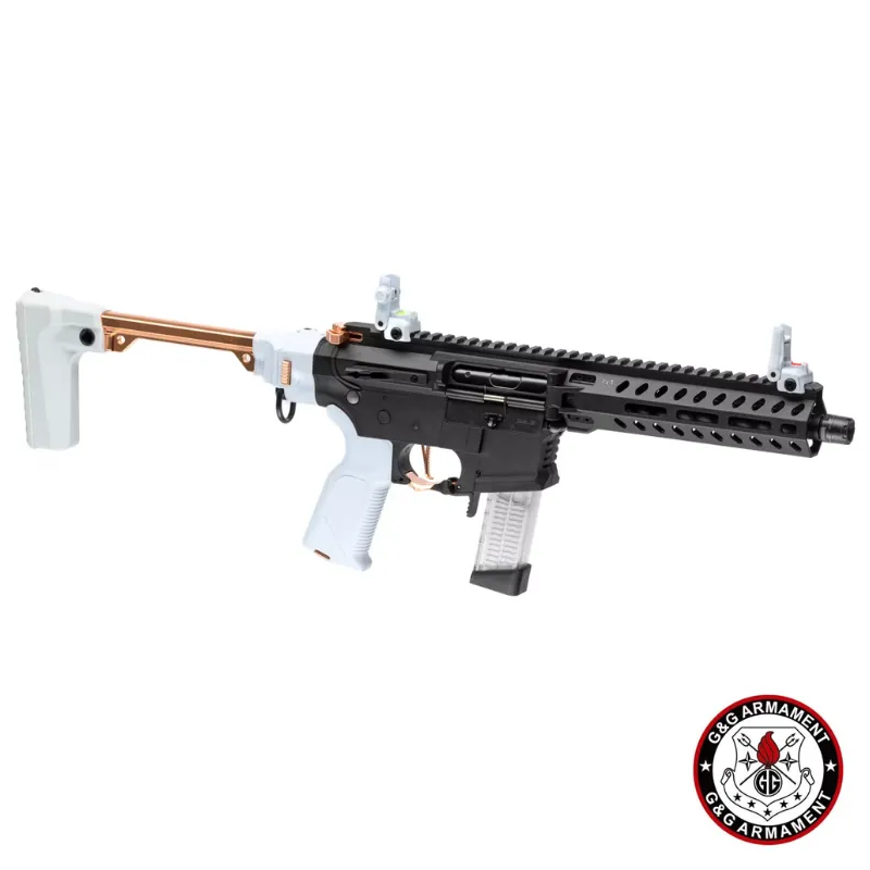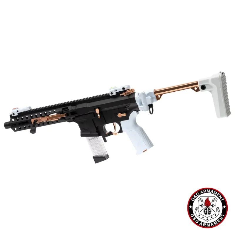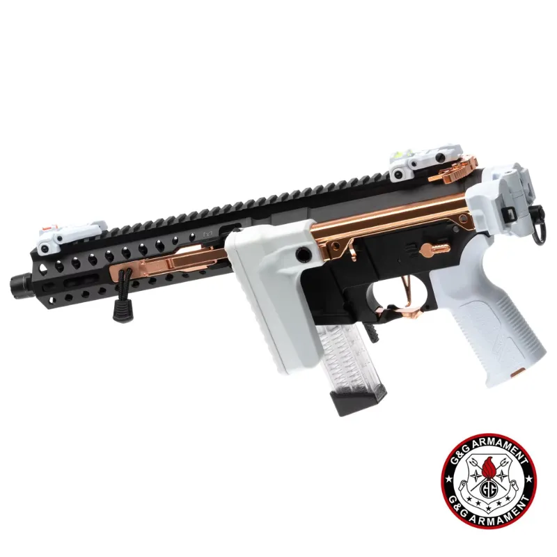 La G&G FAR 9 Macaron combina toda la innovación de la serie FAR 9 con un acabado estético único en color “Macaron Negro, Blanco y cobre”. Se trata de un AEG plegable de pistón eléctrico con caja de cambios V2 full-metal, sistema **MOSFET integrado (MIG)** y unidad ETU 2.0, ideal para jugadores que buscan versatilidad, rendimiento y estilo llamativo en combate.