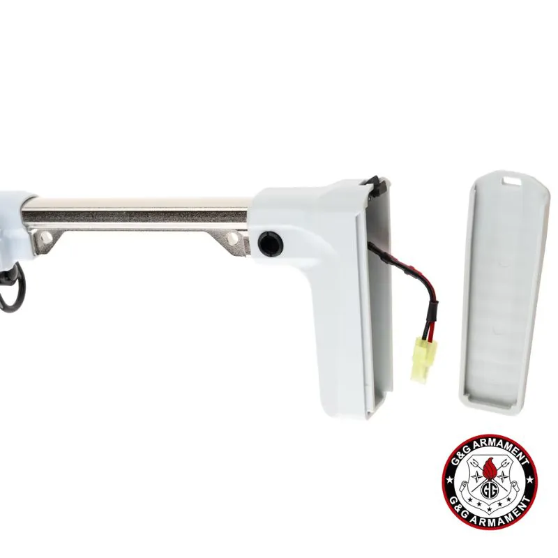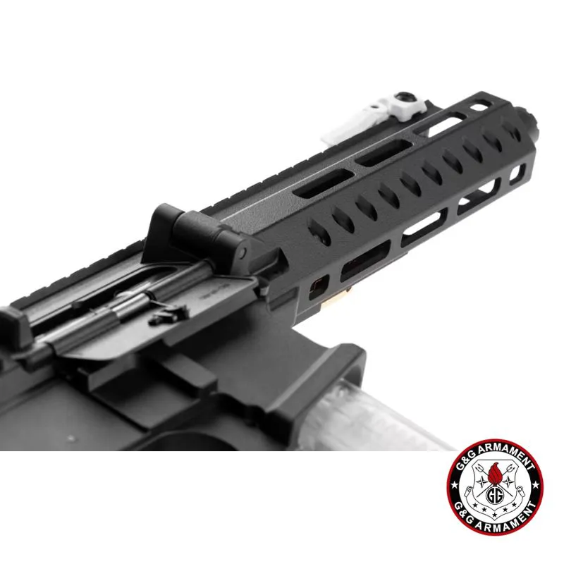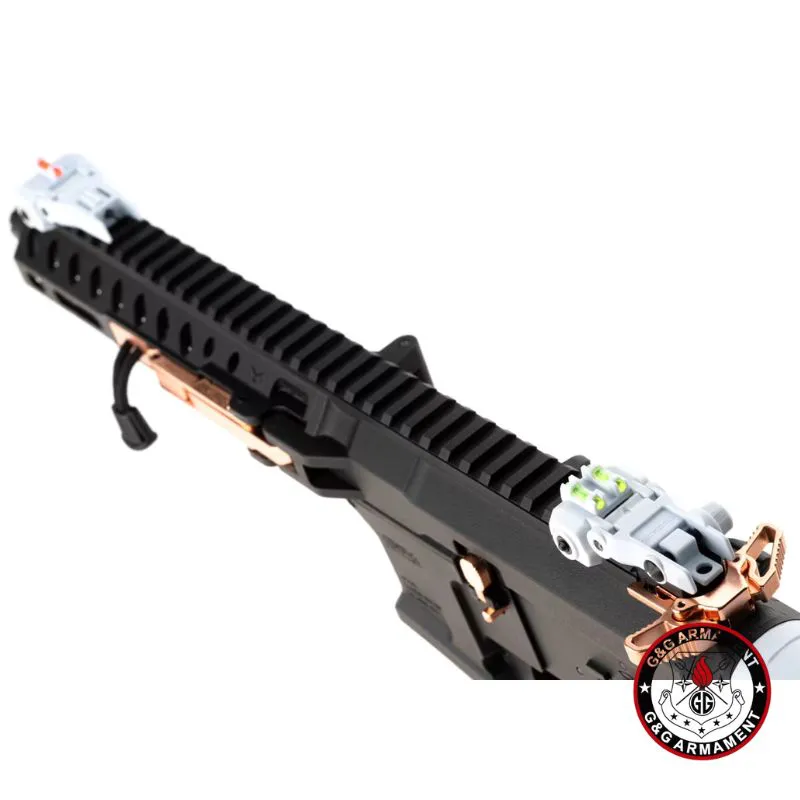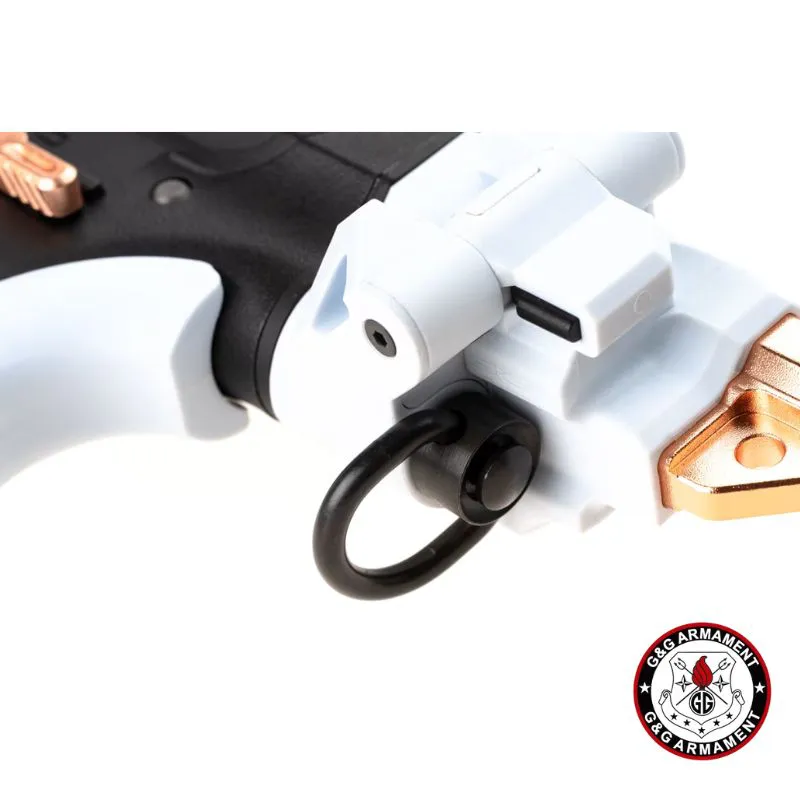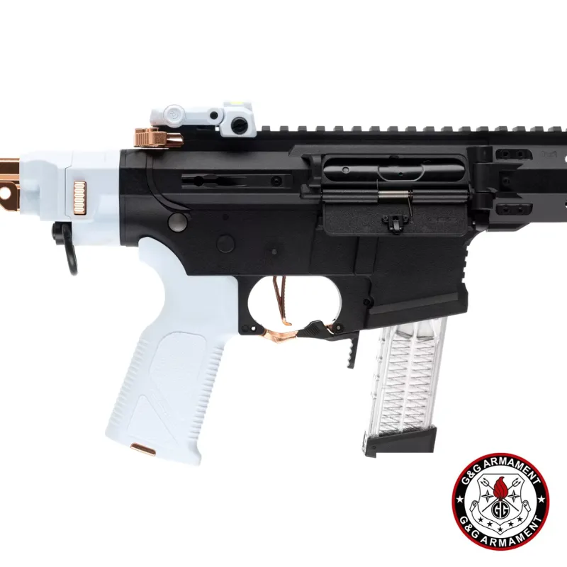 La G&G FAR 9 Macaron combina toda la innovación de la serie FAR 9 con un acabado estético único en color “Macaron Negro, Blanco y cobre”. Se trata de un AEG plegable de pistón eléctrico con caja de cambios V2 full-metal, sistema **MOSFET integrado (MIG)** y unidad ETU 2.0, ideal para jugadores que buscan versatilidad, rendimiento y estilo llamativo en combate.