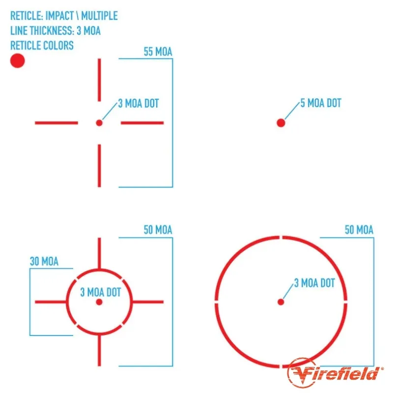 La Firefield Impact XLT incorpora 4 tipos de retícula en color rojo, permitiendo adaptar la visualización según la preferencia del usuario o el entorno. Esta versatilidad mejora la experiencia en distintos escenarios de uso.
