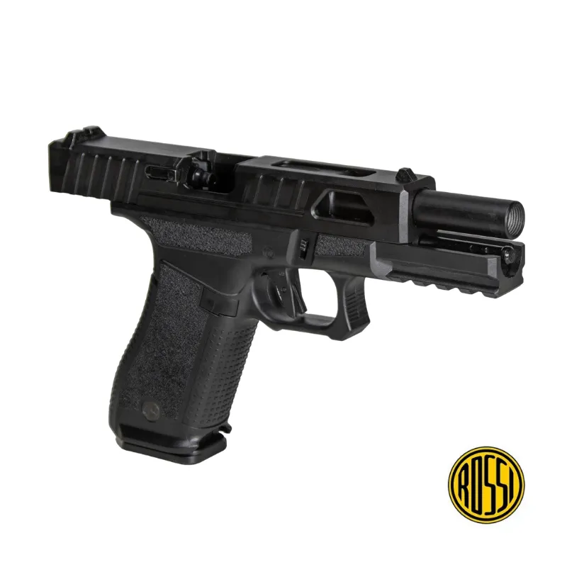 La corredera presenta un diseño táctico con líneas definidas y cortes modernos que no solo mejoran la estética, sino que aportan una apariencia más profesional y personalizada. Además, incluye marcajes Rossi tanto en la corredera como en el puño.