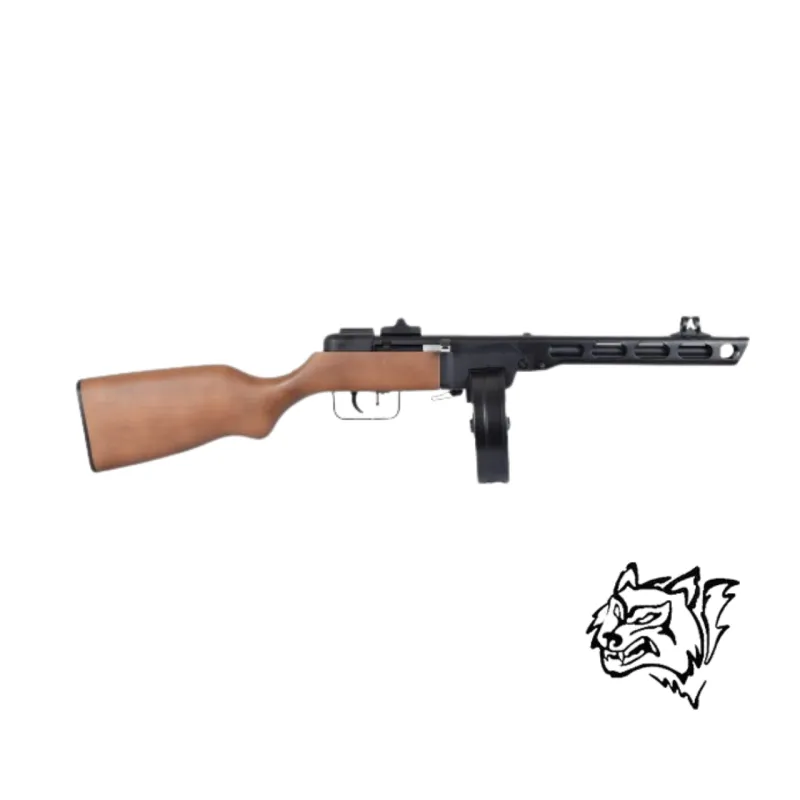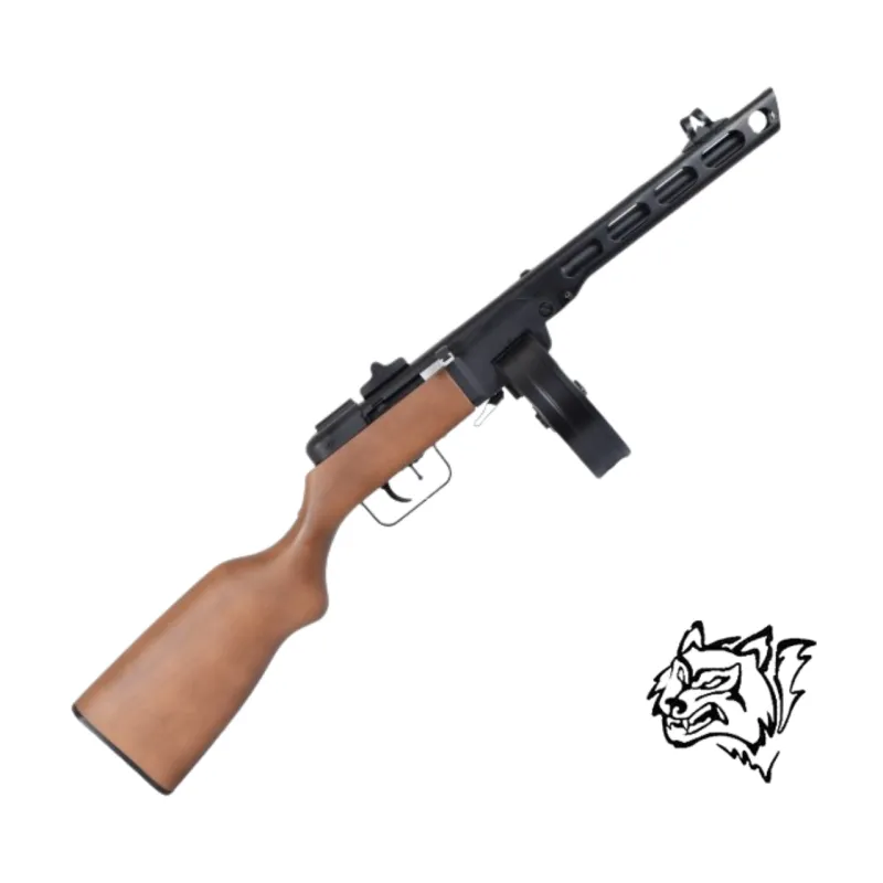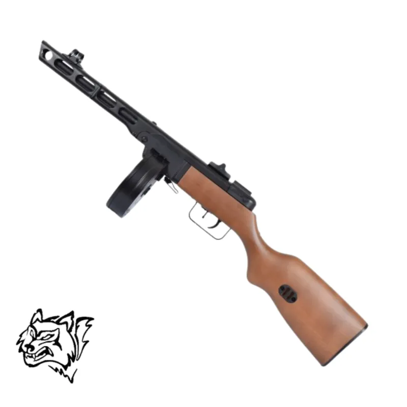 El Snow Wolf PPSH-41 es un subfusil eléctrico (AEG) que destaca por su impresionante capacidad de fuego, su diseño histórico y su construcción en materiales de alta calidad. Esta réplica combina metal y madera auténtica para ofrecer una experiencia realista tanto en estética como en sensaciones durante el uso.