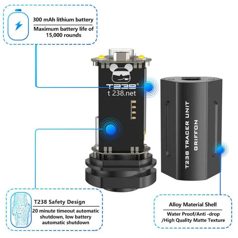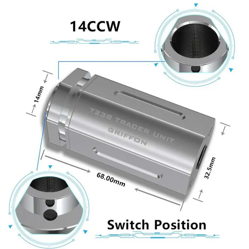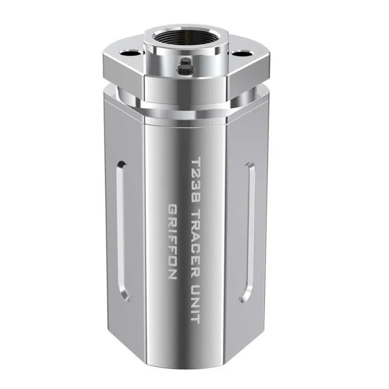 El silenciador trazador T238 Griffon en color plata combina estética impactante y tecnología avanzada en un accesorio diseñado para mejorar tanto el rendimiento como el aspecto de tu réplica. Su tamaño compacto lo hace perfecto para pistolas, subfusiles y fusiles, con una presencia táctica que no pasa desapercibida.